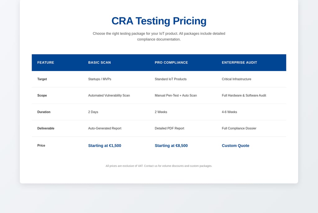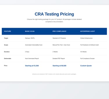 Validate your IoT products against the Cyber Resilience Act. From vulnerability scanning to penetration testing—we ensure your compliance.