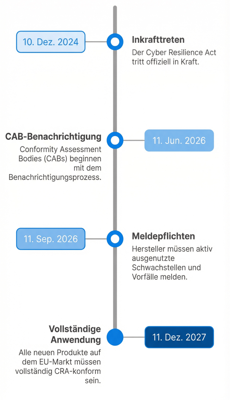 A: Der CRA gilt für Produkte, die nach dem Inkrafttreten (Dezember 2027) in Verkehr gebracht werden. Werden jedoch wesentliche Änderungen an einem bestehenden Produkt vorgenommen, kann dieses als neues Produkt gelten und muss konform sein. Reine Sicherheitsupdates lösen dies in der Regel nicht aus.